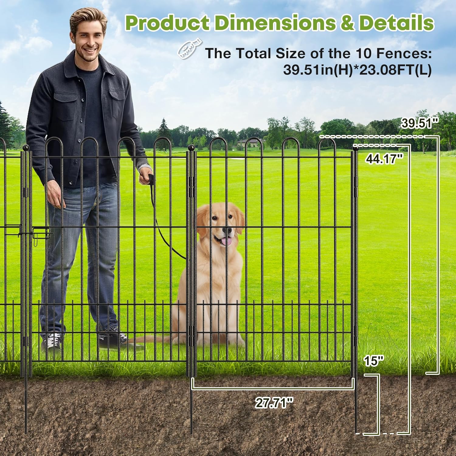 - 【Expandable Metal Fence Panels】 This fence set includes 10 individual panels plus a latch gate. Each panel measures 39.51in (H) X 27.71in(W), with a total assembled length of 23.08ft. The fencing panels are designed to connect seamlessly—whether you’re using them to define garden borders or create outdoor animal containment, you can easily adjust and expand the fence to fit your specific needs