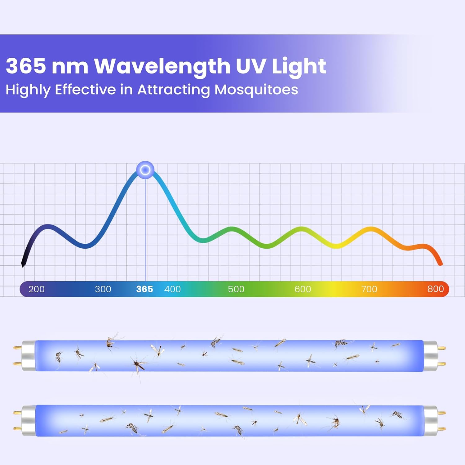 - 365nm UV Light: Scientifically tuned 365nm wavelength UV light utilizes a specific frequency to effectively attract mosquitoes, gnats, moths, fruit flies, and other flying insects, drawing them into the mosquito trap for effective elimination.