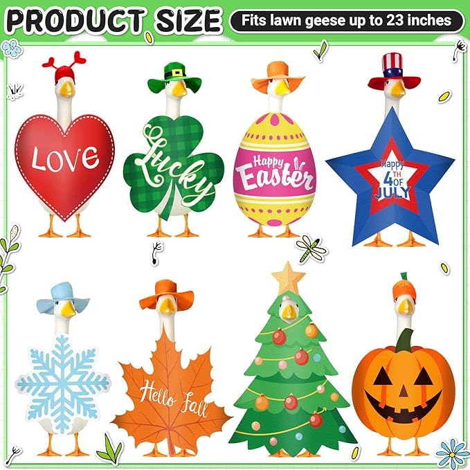 - Holiday Goose Outfits Pack: this package includes 8 sets holiday porch goose outfits, covering festive designs for Fall, Halloween, Christmas, Valentine's Day, Easter, St. Patrick's Day, and Patriotic Day; Dress up your 23" lawn goose to match every major season and holiday throughout the year, bringing joy to your garden all year long