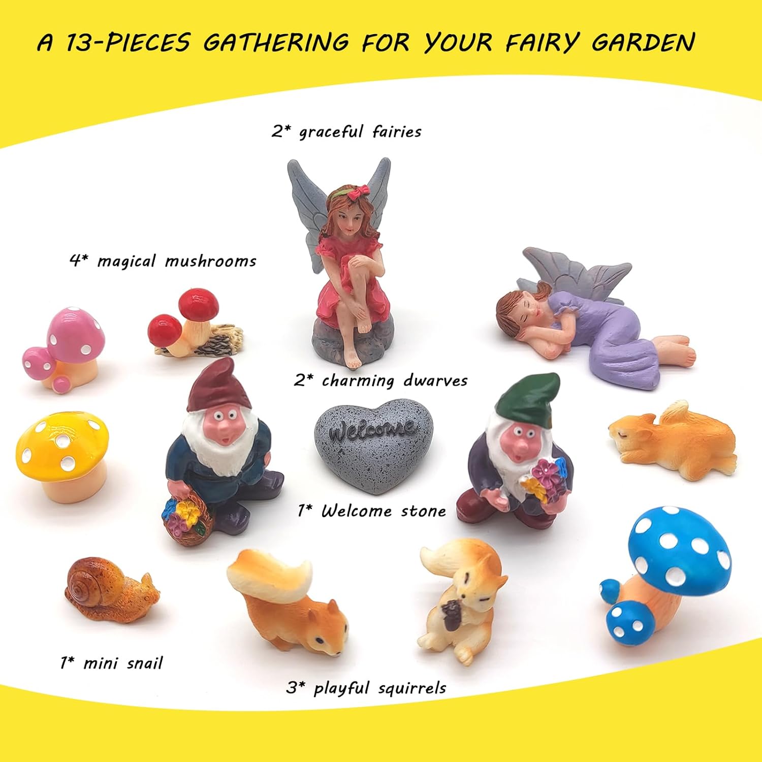 - 【Fairy Garden Kit】- Our 13pcs fairy garden set is carefully designed to tell a harmonious story. With 2 graceful fairies in unique poses and colors, 2 charming dwarves, 3 playful squirrels, 4 magical mushrooms, a mini snail and a Welcome stone, you can create a vibrant and lifelike enchanted scene that sparks imagination and wonder