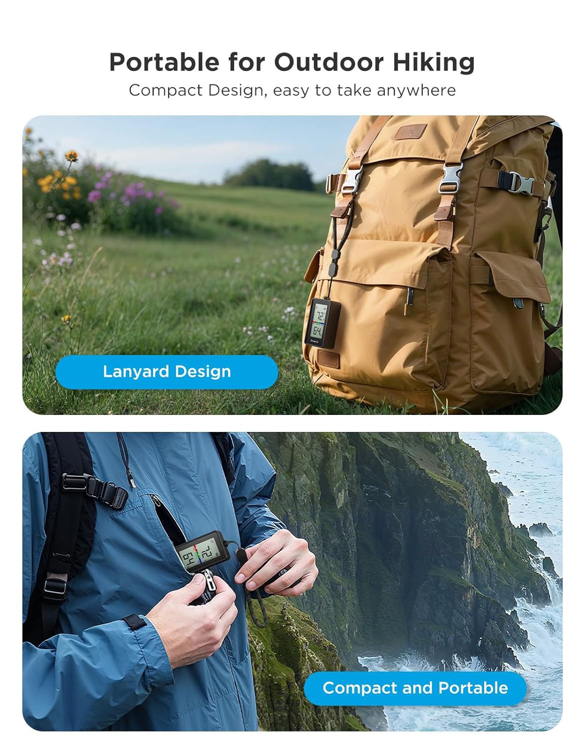 - Portable Design: IP65-rated Waterproof thermometer helps you withstand rain and moisture during camping, hiking, and rock climbing. The dustproof and sun-resistant casing can withstand tougher outdoor environments. Pocket-sized design for easy storage in hard-shell jackets and backpacks.