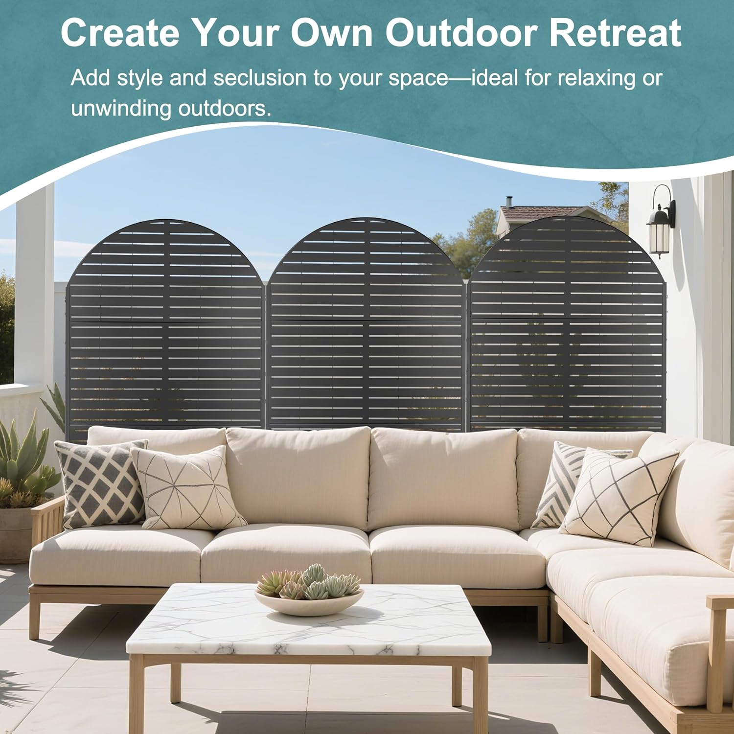 FENCY Metal Privacy Screen with Stand 72" H×47" W Outdoor Freestanding Privacy Panels, Arched Outdoor Privacy Screen for Deck Patio Balcony(Black-Louvered)