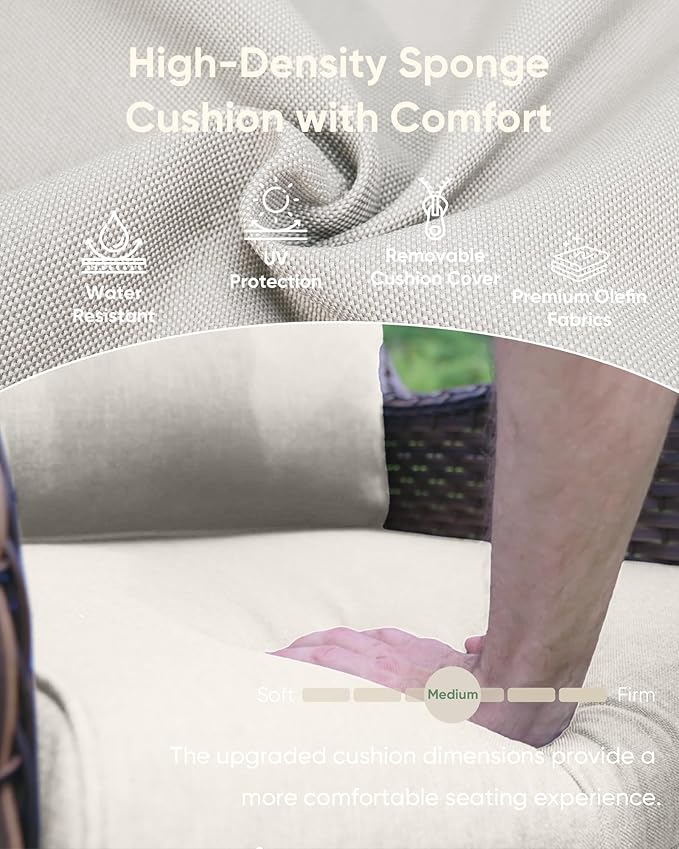 - Premium All-Weather Durability- Handwoven PE rattan resists UV rays, rain, and rust, while the powder-coated steel frame ensures long-term stability. Olefin fabric cushions are waterproof, fade-resistant, and easy to clean—ideal for year-round outdoor use.