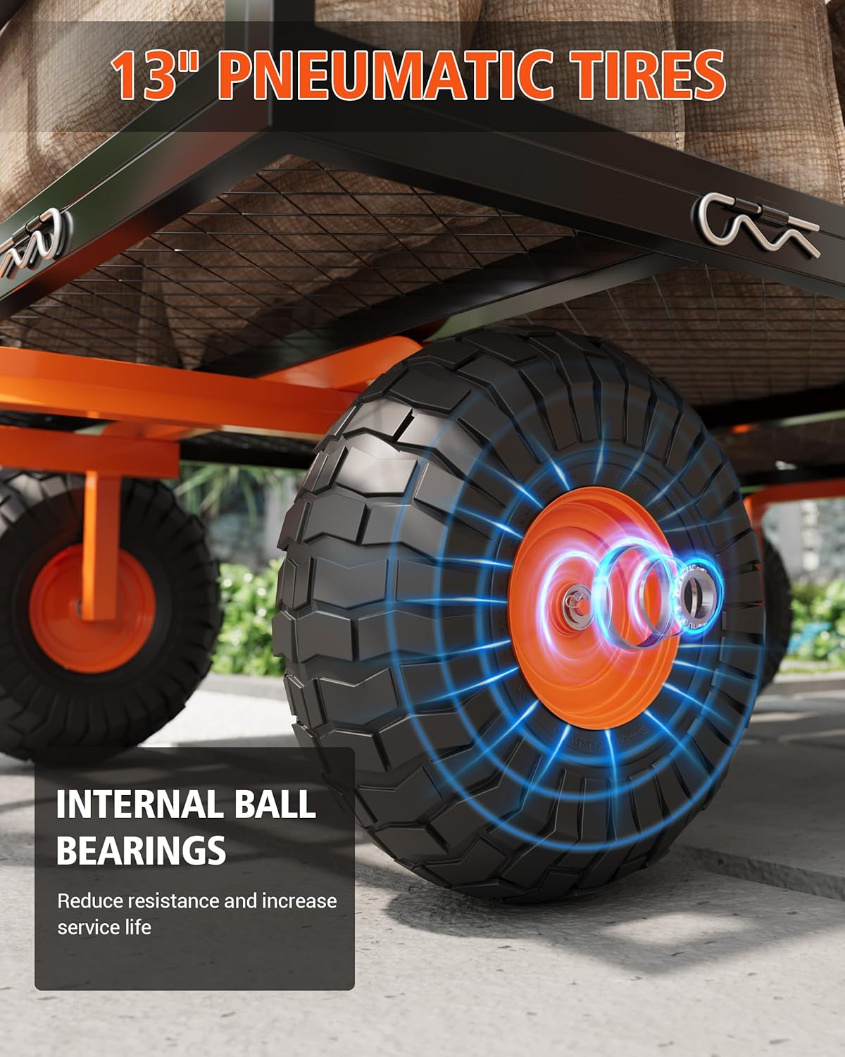 - Conquer Every Landscape: 13" silent-roll tires eat through mud and snow without rattling your tools or waking the napping baby. Wide treads stay stable on slopes and uneven paths – no more wrestling stuck wheels mid-project