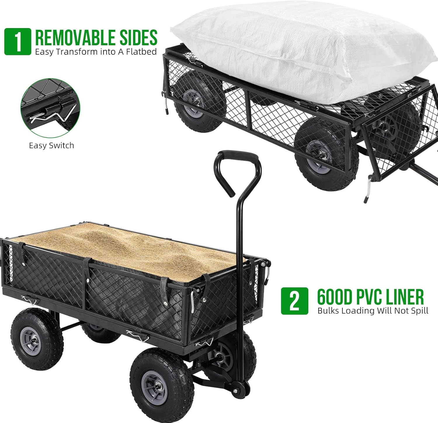 - Convertible Design – Transform the cart into a flatbed in minutes by detaching the side panels, simplifying the loading of bulky items. No need for a larger cart—this adaptable design handles oversized objects with ease, saving you time and effort